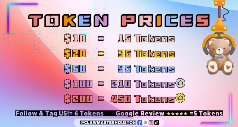 Grab your tokens at the front counter and dive into the fun! Play any claw machine, win amazing prizes, and keep everything you catch — or trade up for even bigger, exclusive rewards. The more you play, the more chances you have to win big!